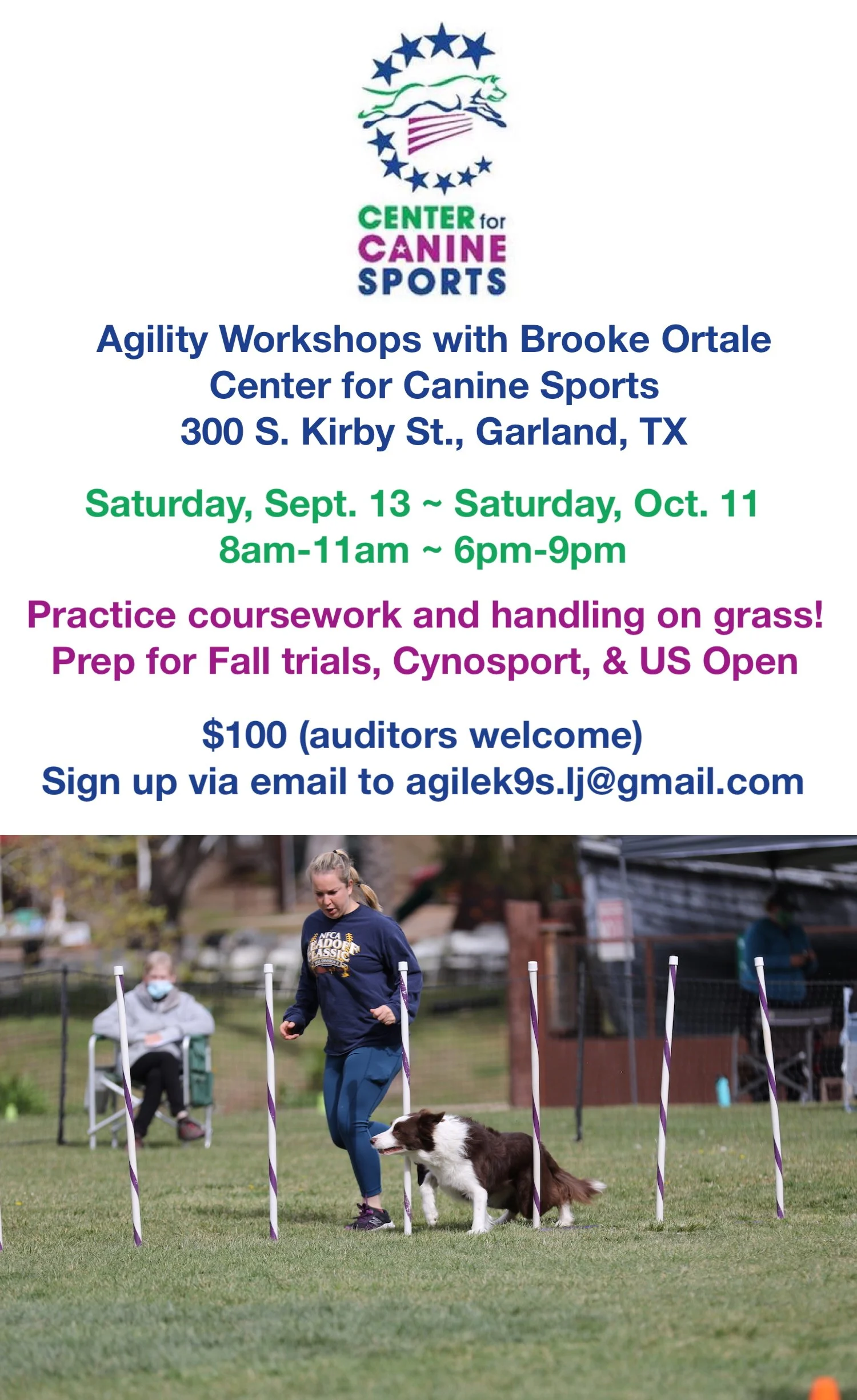 Come on out to Center for Canine Sports in Garland, TX, for our Fall agility workshops with Brooke Ortale. Brooke has grown up running agility and has a lifetime of training expertise. She has enjoyed local, regional, and national success, including top finishes at the Cynosport World Games of Dog Agility.